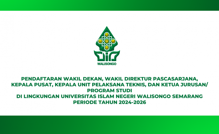 PENGUMUMAN Nomor: 1323/Un.10.0/R/HK.03/03/2024 Tentang PENDAFTARAN WAKIL DEKAN, WAKIL DIREKTUR PASCASARJANA, KEPALA PUSAT, KEPALA UNIT PELAKSANA TEKNIS, DAN KETUA JURUSAN/ PROGRAM STUDI DI LINGKUNGAN UNIVERSITAS ISLAM NEGERI WALISONGO SEMARANG PERIODE TAHUN 2024-2026 SELENGKAPNYA UNDUH DISINI