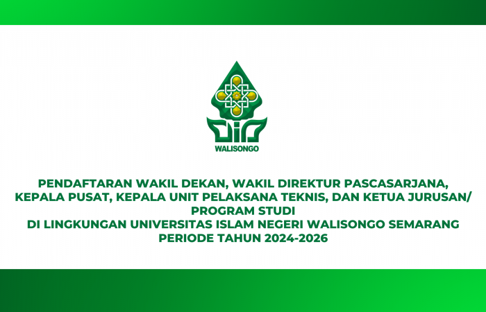 PENGUMUMAN Nomor: 1323/Un.10.0/R/HK.03/03/2024 Tentang PENDAFTARAN WAKIL DEKAN, WAKIL DIREKTUR PASCASARJANA, KEPALA PUSAT, KEPALA UNIT PELAKSANA TEKNIS, DAN KETUA JURUSAN/ PROGRAM STUDI DI LINGKUNGAN UNIVERSITAS ISLAM NEGERI WALISONGO SEMARANG PERIODE TAHUN 2024-2026 SELENGKAPNYA UNDUH DISINI