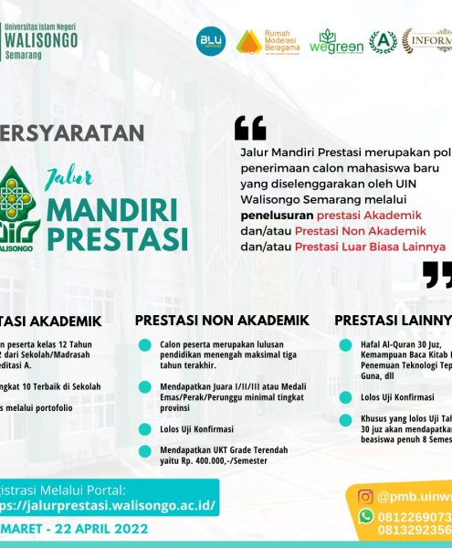 UIN Walisongo Online: Semarang – UIN Walisongo Semarang resmi membuka jalur mandiri prestasi bagi calon mahasiswa untuk tahun ajaran 2022-2023. Jalur mandiri prestasi dibuka mulai 1 Maret 2022 hari ini...