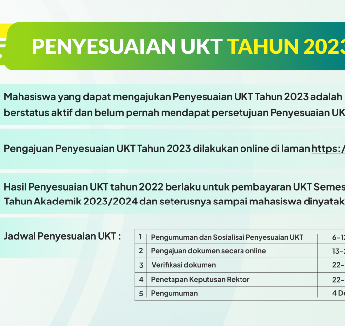 PENGUMUMAN PENYESUAIAN UKT TAHUN 2023 Penyesuaian Uang Kuliah Tunggal (UKT) merupakan mekanisme yang disediakan oleh UIN Walisongo kepada mahasiswa yang mengalami perubahan...