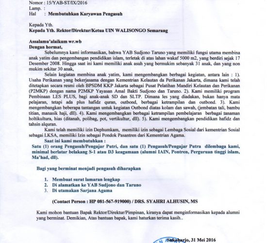 LOWONGAN PENGASUH pada YAYASAN AMAL BAKTI SUDJONO & TARUNO Satu (1) orang Pengasuh/Pengajar Putri, dan satu (1) orang Pengasuh/Pengajar Putra di Yayasan...