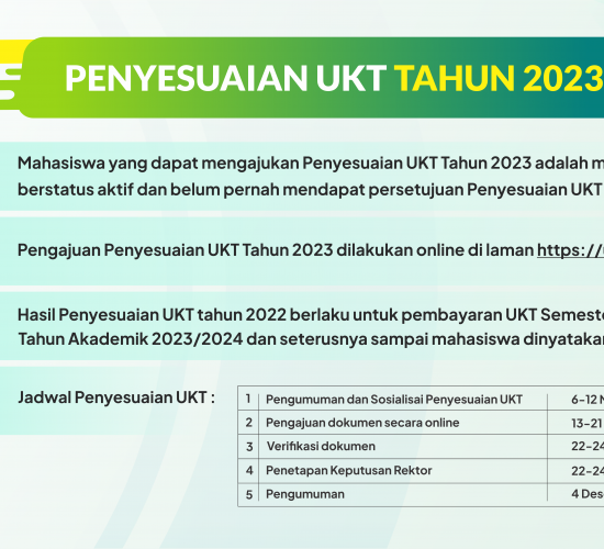 PENGUMUMAN PENYESUAIAN UKT TAHUN 2023 Penyesuaian Uang Kuliah Tunggal (UKT) merupakan mekanisme yang disediakan oleh UIN Walisongo kepada mahasiswa yang mengalami perubahan...