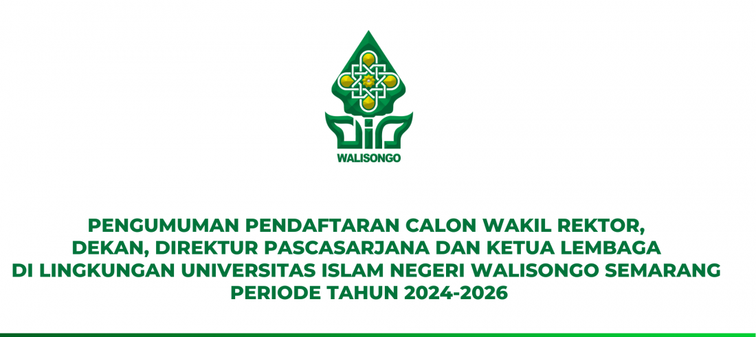 PENGUMUMAN Nomor: 1205/Un.10.0/R/HK.03/03/2024 TENTANG PENDAFTARAN CALON WAKIL REKTOR, DEKAN, DIREKTUR PASCASARJANA DAN KETUA LEMBAGA DI LINGKUNGAN UNIVERSITAS ISLAM NEGERI WALISONGO SEMARANG PERIODE TAHUN 2024-2026 SELENGKAPNYA UNDUH DISINIRead More
