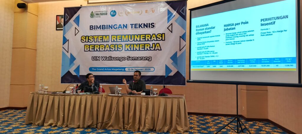 UIN Walisongo Online, Magelang – UIN Walisongo Semarang menyelenggarakan kegiatan Bimbingan Teknis (Bimtek) Sistem Remunerasi Berbasis Kinerja yang berlangsung selama tiga hari, Senin–Rabu (12–14/01/2025), bertempat di Hotel Artos Magelang. Kegiatan ini diikuti oleh 40 peserta yang terdiri dari Tim Remunerasi, Tim Verifikator Indikator Kinerja Utama (IKU), serta Verifikator Sasaran Kinerja Pegawai (SKP).